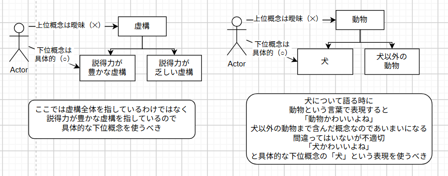 ・抽象概念を使うときは、安易に上位概念を使わず、より具体的な下位概念を使え。