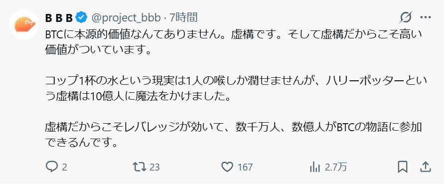 1.BTCに本源的はなく虚構です。